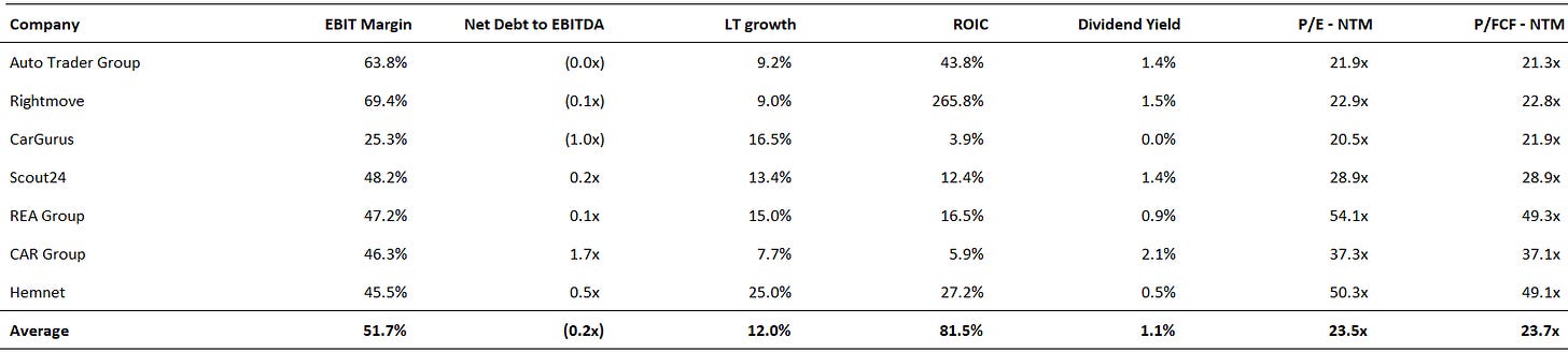 The company trades on a forward P/E of 22x and 4.5% FCF yield, a 7% discount to 10-year historical multiples and 7-10% discount to peers. These multiples are attractive for a dominant business with leading financials, durable growth and strong management. Peers such as Hemnet, REA Group and CAR Group are shown below but excluded from averages due to high valuations.