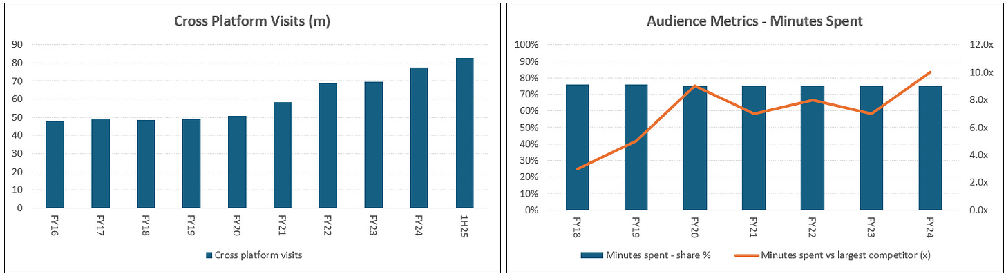 1. The competitive moat continues to grow due to a self-fulfilling network effect, reinvestment and weaker competition. Auto Trader attracts 3x more unique monthly visitors and 10x more user minutes than its nearest competitor, which is up from 3x in FY18. Previous challengers have scaled back investments given the time, effort and capital required to disrupt the network effect of a clear market leader. With the most engaged audience, Auto Trader drives outsized value via faster sales and better pricing for customers, enabling them to command premium pricing.