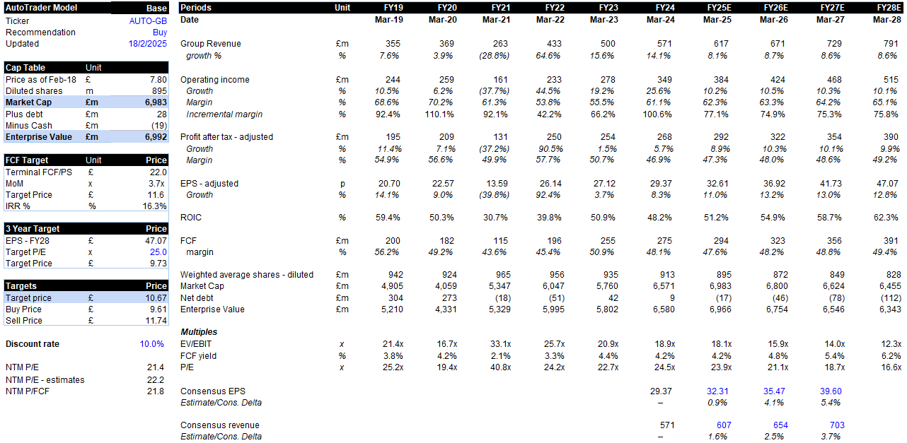 View – Accumulate, near-term impacts on used car stock are likely cyclical, providing an opportunity to invest in a high-quality compounder with a strong management team, culture and leading financials. Operating margins are 62%, ROIC is 51%, FCF conversion is 100% and capex to sales is <1%. The competitive position has never been stronger while there is significant operational momentum. The business trades on a forward P/E of 22x and FCF yield of 4.5%, with EPS growing in the low-teens. Using a blended 50:50 discounted FCF (10% discount rate) and P/E multiple valuation, returns a target price £10.7. Would be buying the stock up to £9.60, representing a 10% discount to target price.