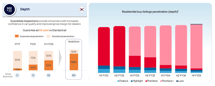 - Advanced (depth) packages – the share of stock above standard packages has grown from 0% in FY17 to 35% in FY24. There is still room for further growth as dealers seek to differentiate stock in more balanced markets. The below shows Korea’s SC Encar’s (left) depth growth to 50% while REA Group (right) has continually layered new depth products over time.